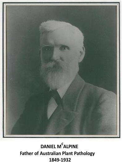The lecture commemorates the life and work of Daniel McAlpine and his contribution to the science of plant pathology. He was born in Scotland, and arrived in Australia in 1884 at the age of 35. He had already received considerable training in biology, and became a lecturer at the University of Melbourne. Six years later he became vegetable pathologist in the Department of Agriculture. At the time, plant pathology and plant breeding were facing the challenge of coping with the stem rust epidemics, so McAlpine, together with Farrer became involved. Over the next 26 years McAlpine published 226 papers, a monograph on rusts (1906), and books on the smuts (1910) and on the diseases of citrus (1889), stone fruit (1902) and potatoes (1911). Ron Close (1996) |
